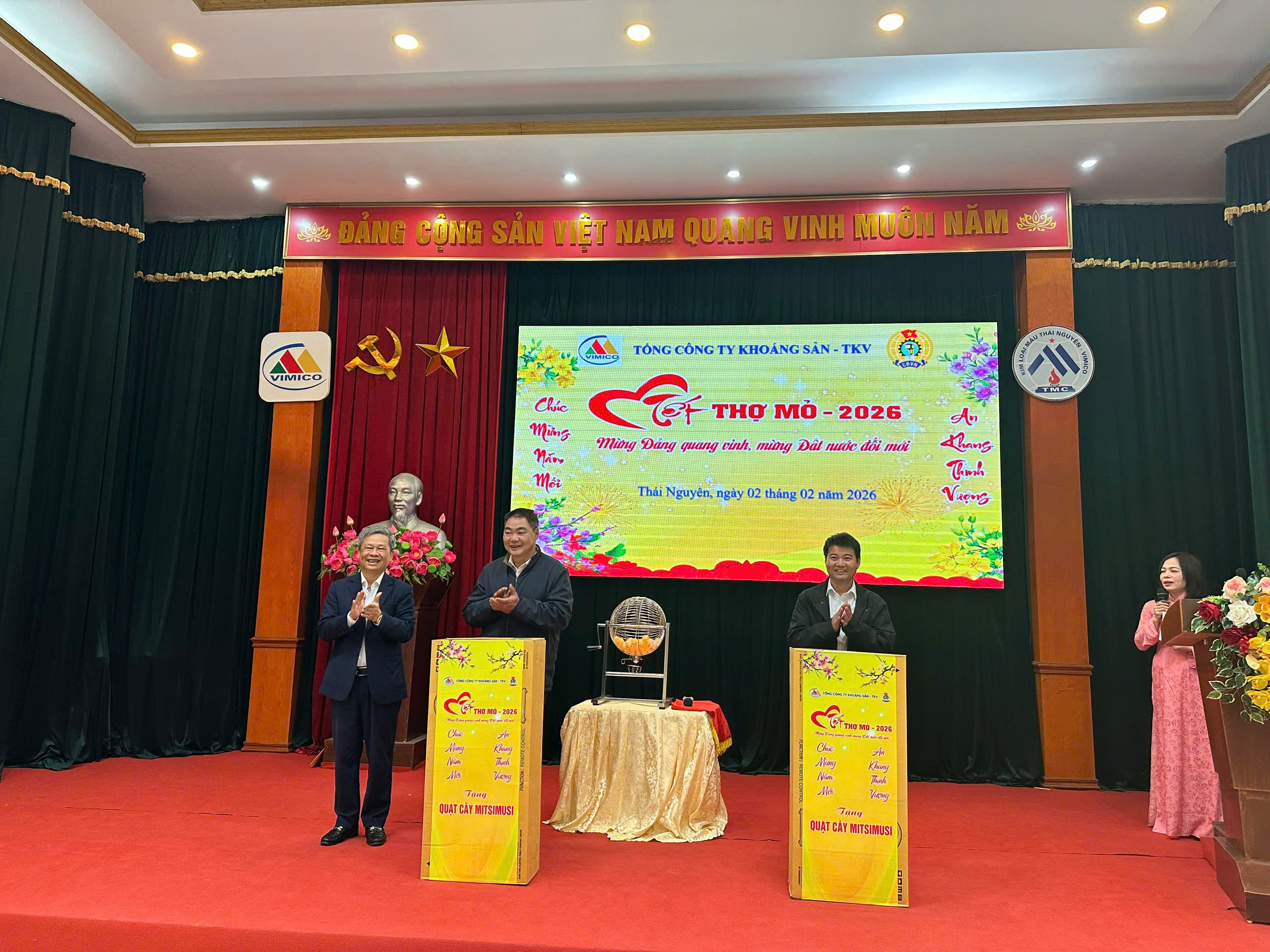 Trong không khí Mừng Đảng – Mừng Xuân, chào mừng thành công Đại hội lần thứ XIV của Đảng; kỷ niệm 96 năm Ngày thành lập Đảng cộng sản Việt Nam (3/2/1930 – 3/2/2026); ngày 02/02/2026 tại trụ sở Công ty Cổ phần Kim loại màu Thái Nguyên – Vimico, Tổng công ty Khoáng sản – TKV tổ chức Chương trình “Tết thợ mỏ – Mừng Đảng quang vinh – Mừng đất nước đổi mới” năm 2026 khu vực Hà Nội – Thái Nguyên. Đến dự chỉ đạo chương trình có đồng chí Hoàng Ngọc Minh – Phó Bí thư Thường trực Đảng ủy Tổng công ty Khoáng sản – TKV, đồng chí Ngô Quốc Trung – Phó Tổng Giám đốc Tổng công ty Khoáng sản – TKV, đồng chí Nguyễn Văn Phục – UV BCH Công đoàn Than – Khoáng sản Việt Nam, Chủ tịch Công đoàn Tổng công ty Khoáng sản, cùng với các đồng chí là UV Ban Thường vụ Đảng ủy, Ban Giám đốc, Kế toán trưởng của 3 đơn vị khu vực Hà Nội – Thái Nguyên. Đặc biệt là sự có mặt của 80 công nhân viên lao động tham dự chương trình.