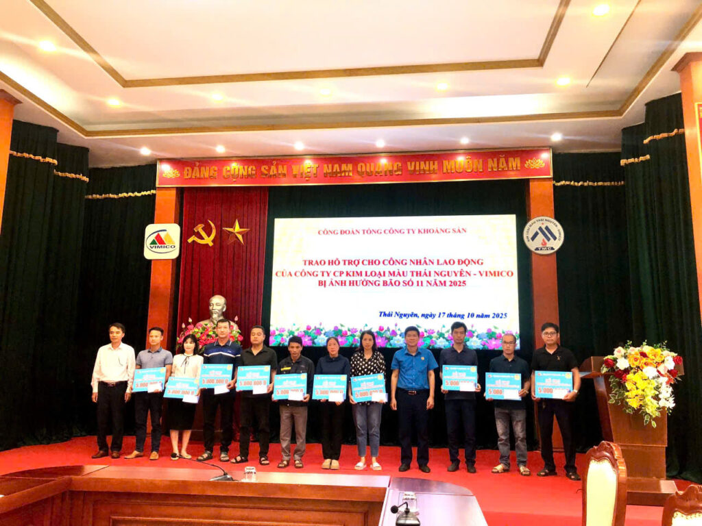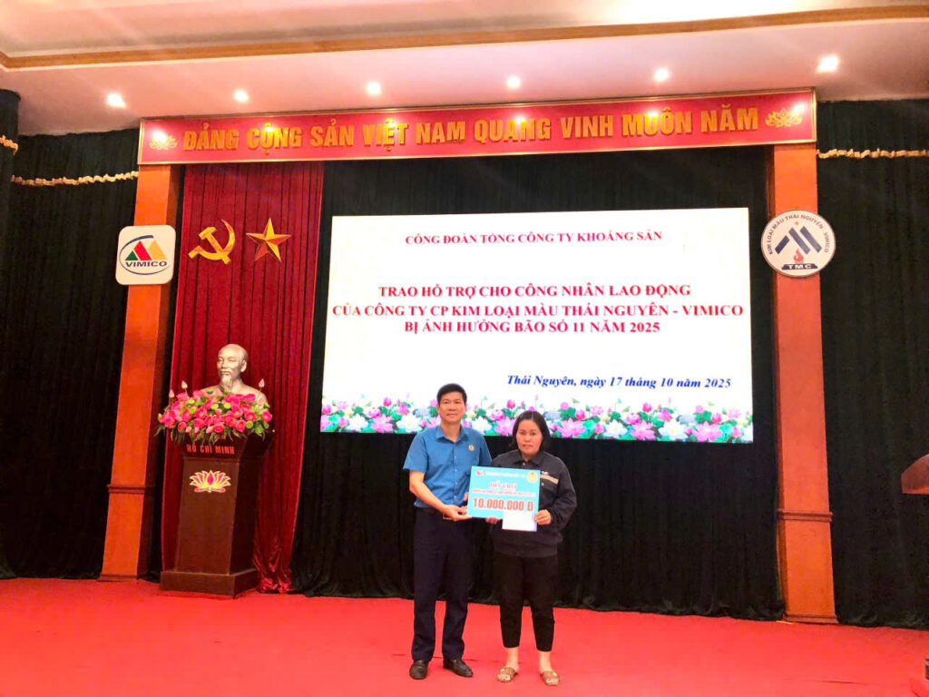 Thực hiện Công văn số 634/CĐTKV-CSPL&QHLĐ ngày 10/10/2025 của Công đoàn Than – Khoáng sản Việt Nam về việc khắc phục bão số 10, 11 gây ra, Tổng công ty Khoáng sản – TKV và Công ty Cổ phần Kim loại màu Thái Nguyên – Vimico đã quan tâm kịp thời và trao hỗ trợ, động viên cho 65 gia đình CNVLĐ của Công ty chịu ảnh hưởng của bão số 11 gây ra, đối với các trường hợp nhà bị ngập, nhà bị tốc mái hoàn toàn, nhà bị sập đổ hoàn toàn, số tiền do Tổng công ty Khoáng sản – TKV hỗ trợ là 325 triệu đồng, số tiền của Công ty Cổ phần Kim loại màu Thái Nguyên – Vimico hỗ trợ là 366 triệu đồng.